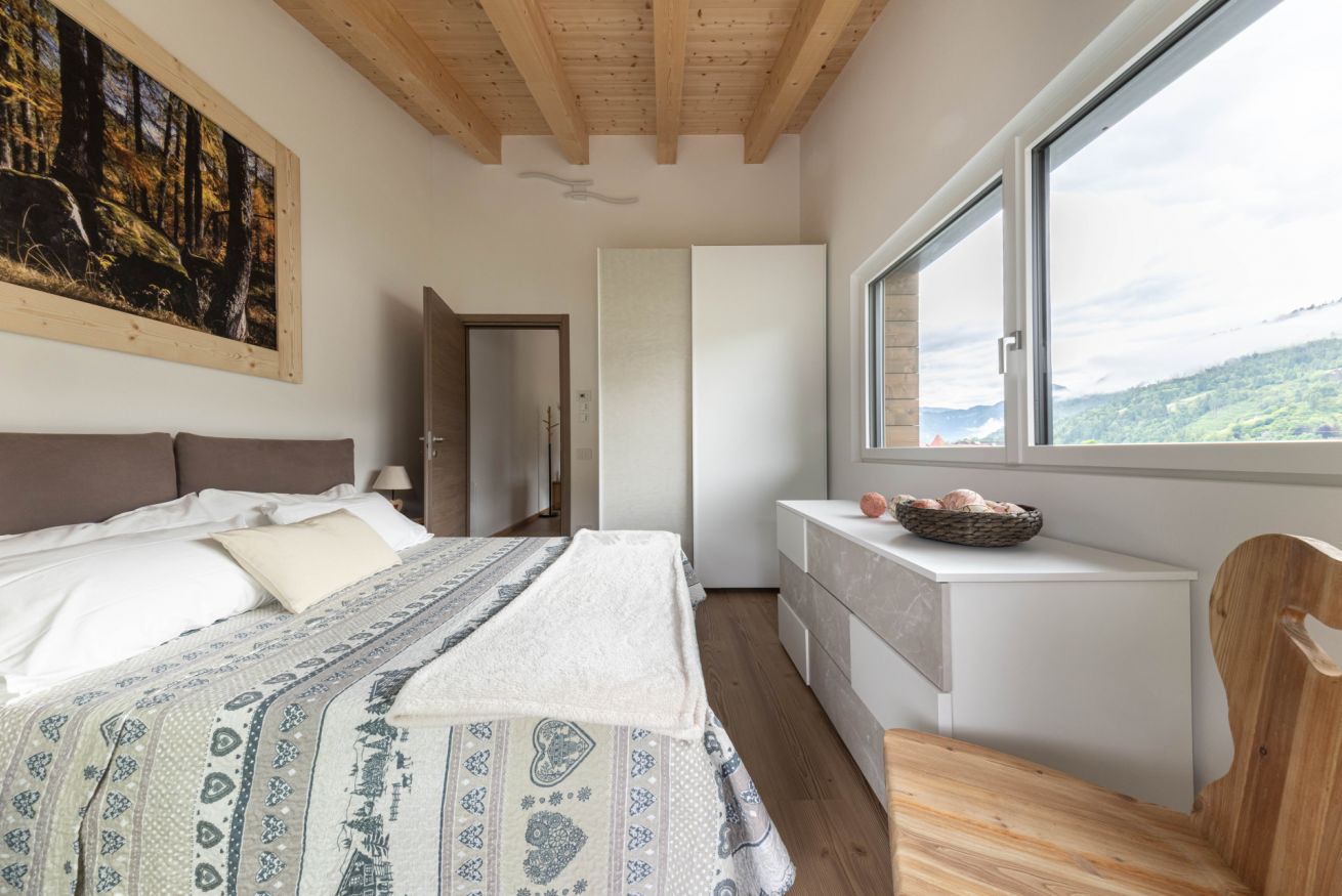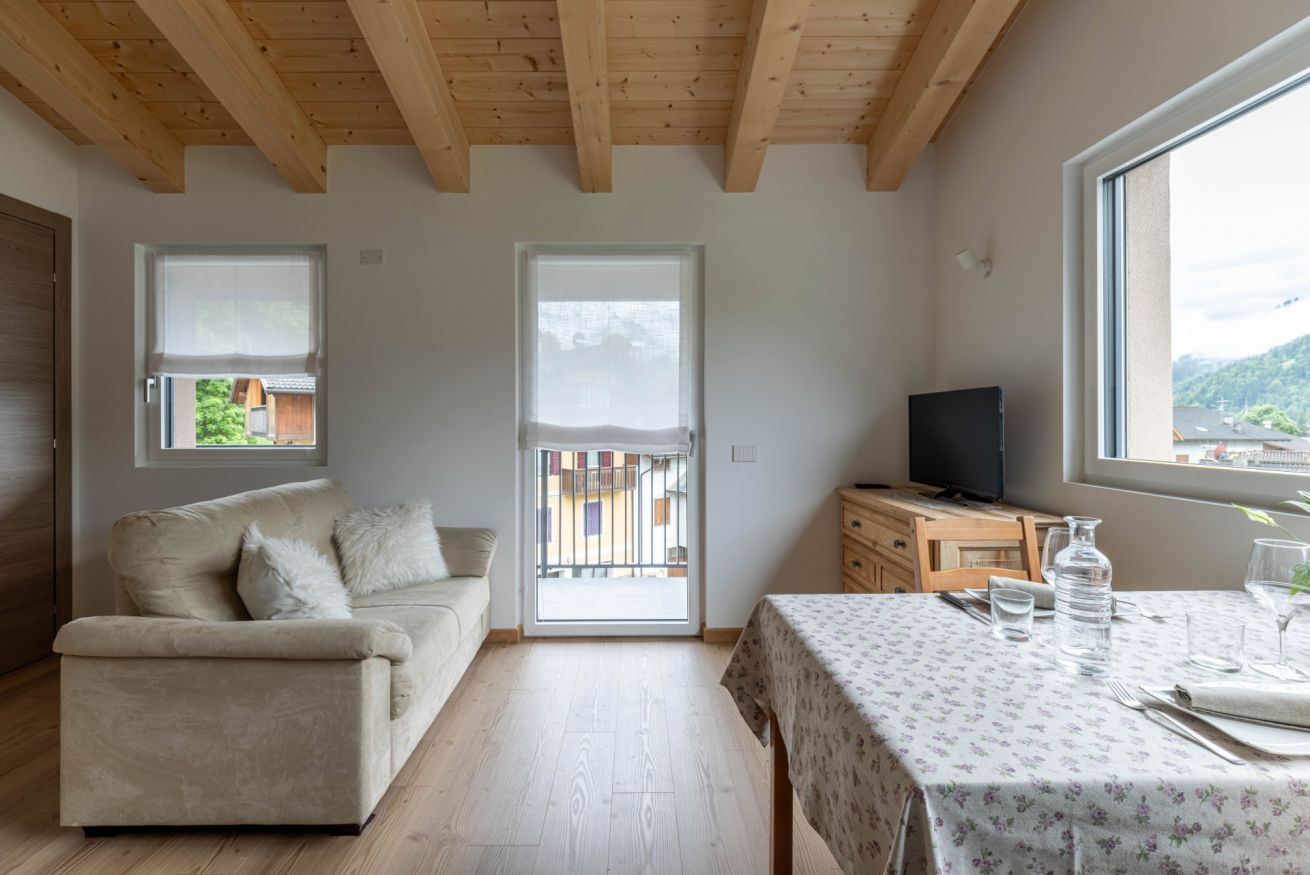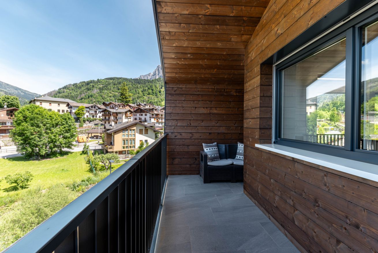Questo appartamento di nuova costruzione può accogliere fino a 2 persone ed è perfetto per una coppia o una famiglia in cerca di tranquillità e comfort. Gli ambienti, curati nei minimi dettagli, si aprono su una spaziosa terrazza panoramica da cui si possono ammirare le Dolomiti, con le Pale di San Martino e il gruppo del Lagorai che incorniciano il paesaggio.